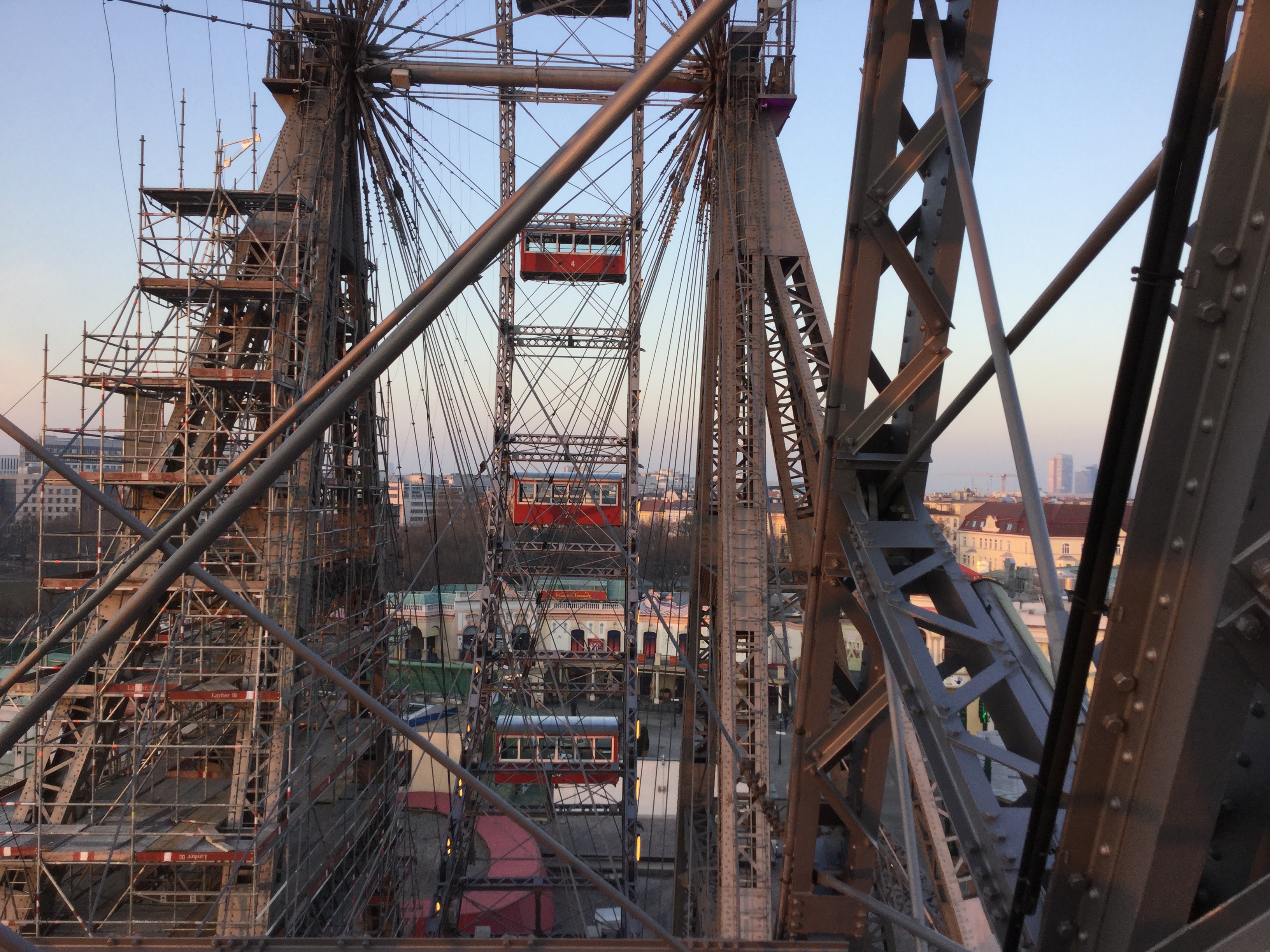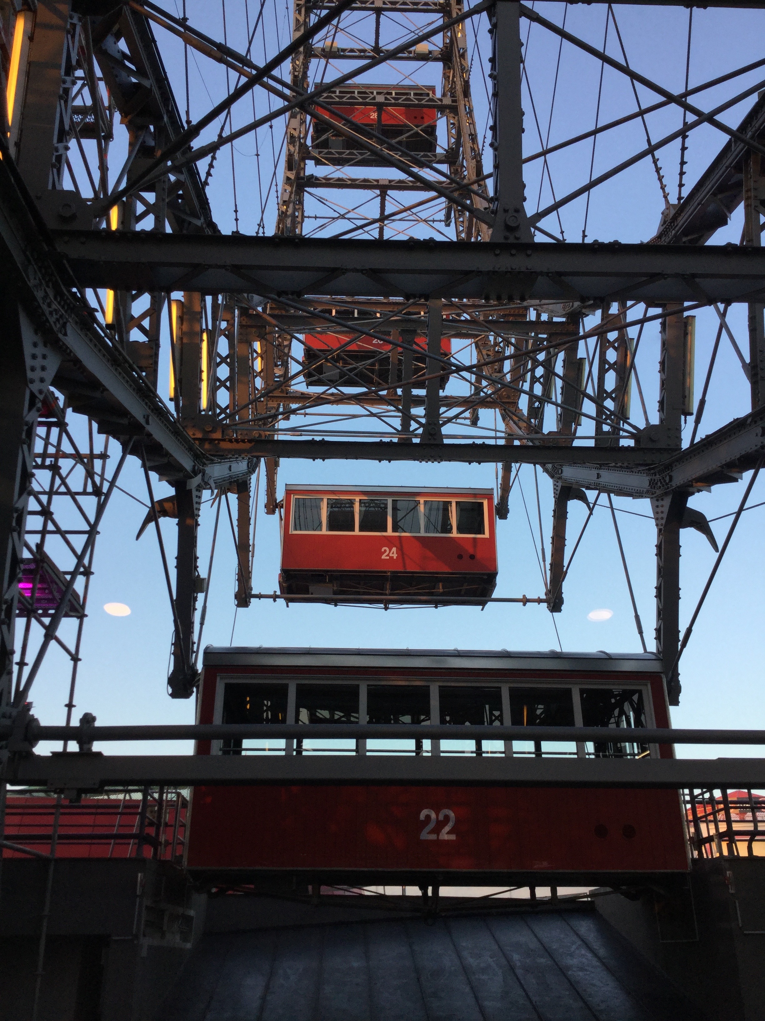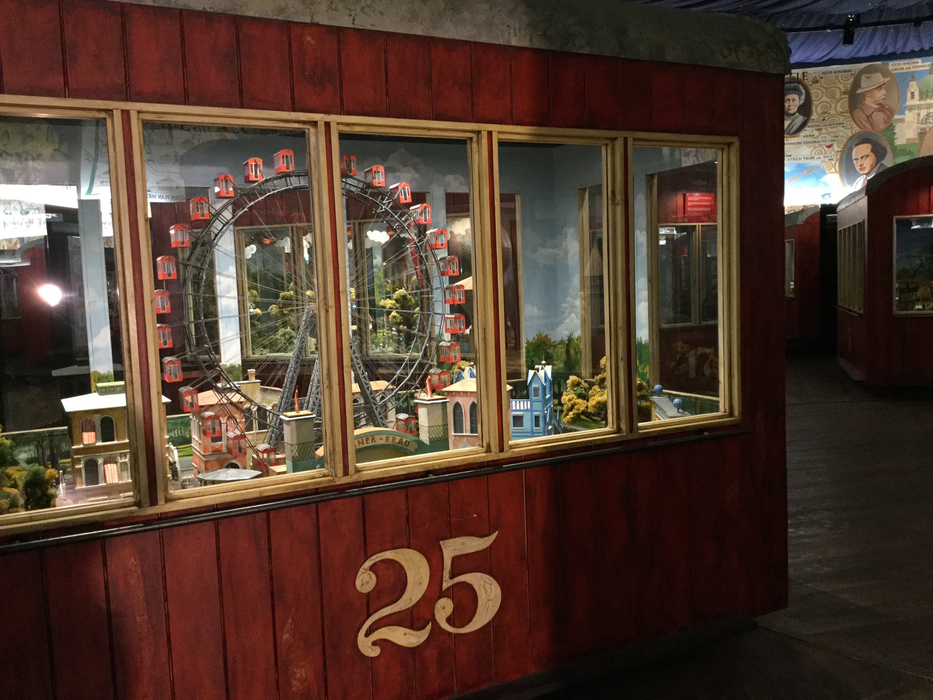 대관람차 내부로 들어가면, 대기하는 장소에 이렇게 대관람차 및 프라터와 관련된 비엔나 역사가 설명되어 있어요. 대관람차가 매우 낡아 보이죠…? 실제로 19세기말 비엔나 만국박람회 기념으로 지어진 상징적인 구조물 입니다. 파리 에펠탑처럼요 :) 그전에도 프라터는 유원지로, 그그전에는 왕실 사냥터로 이용되었다고 하네요.