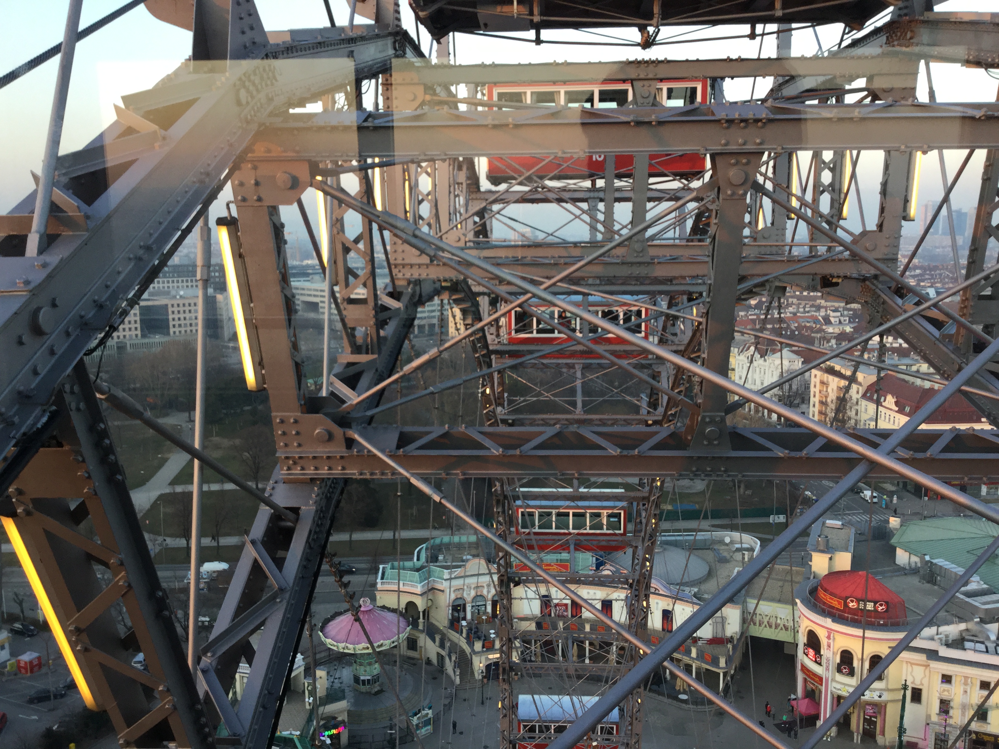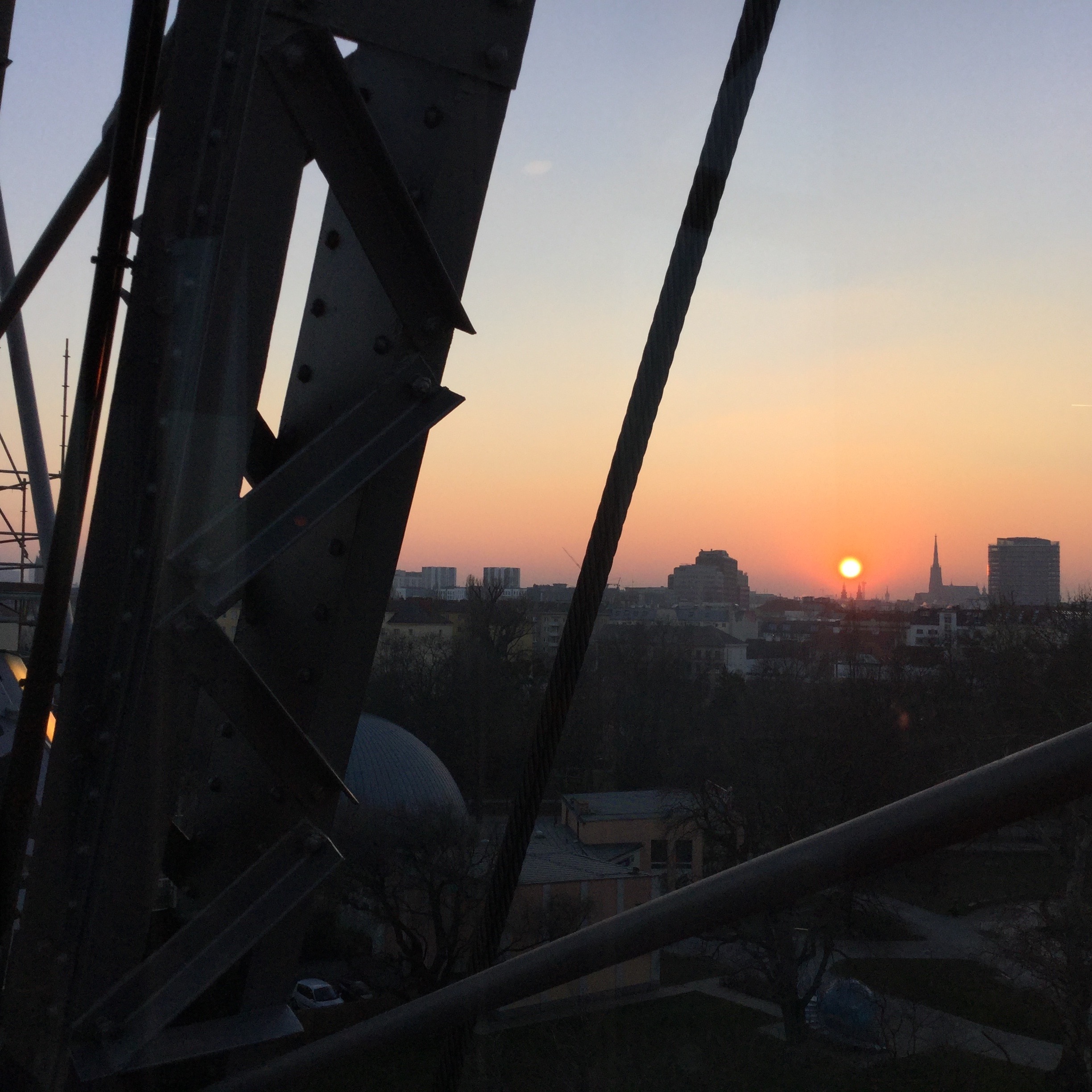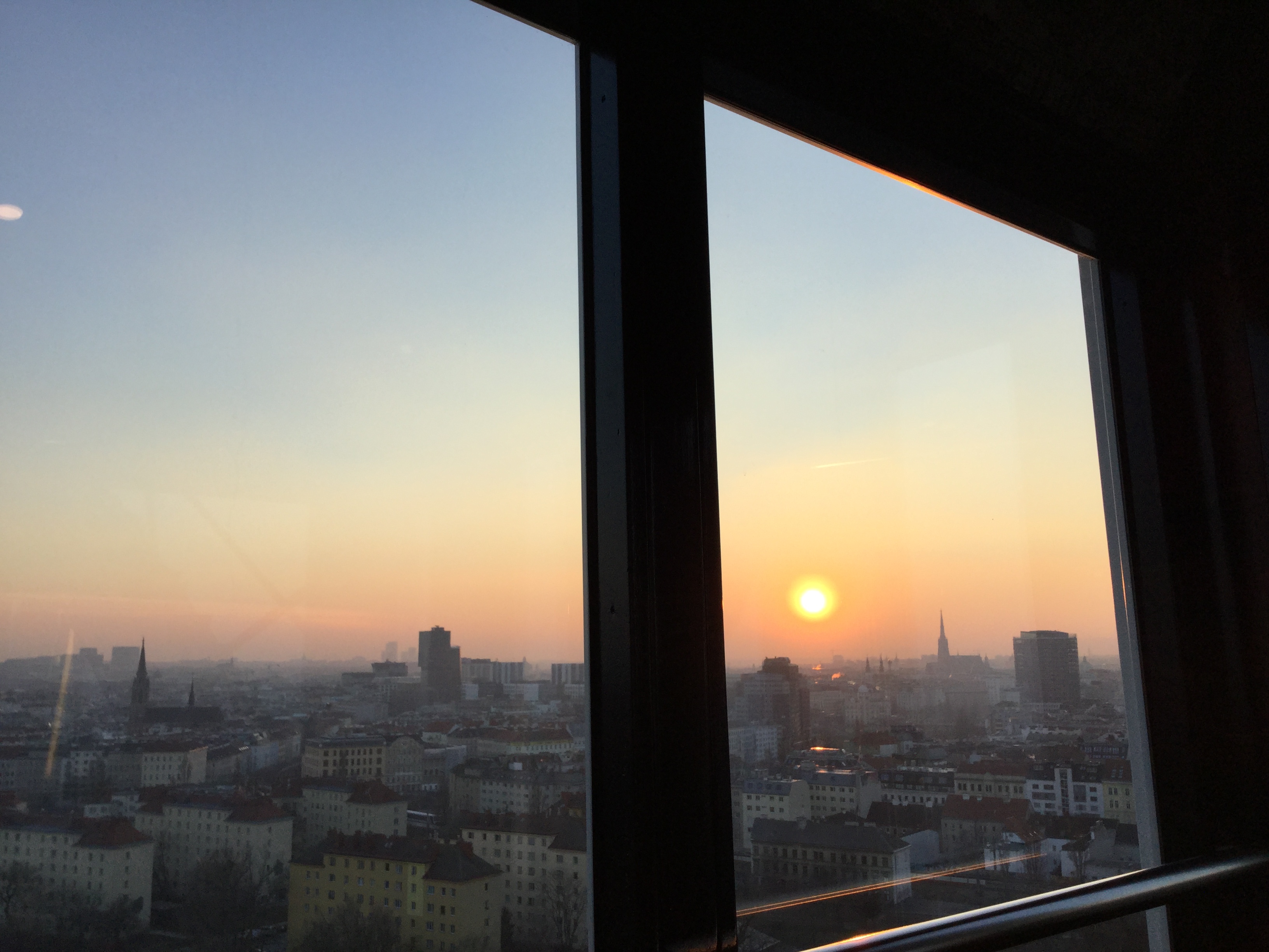 운이 좋았나봐요. 해가 지는 걸 볼 수 있네요. 이제 패닉 상태(?)에서도 벗어나고, 해도 지겠다. 옆예 계신 여자분이랑 짧은 담소를 나눴는데요. 이 분은 스위스에서 비엔나로 출장을 오셨는데, 매번 돌아가긴 전에 꼭 이 대관람차를 타고 집에 가신다고 하네요. 남은 유로화도 소진하기 위해서…ㅋ 저는 박사논문을 내고 놀러 왔다고 하니깐, 정말 축하해 주셨어요.. (그런데 괴팅엔은 어디에 있는지 모르시더라구요..ㅎㅎ)