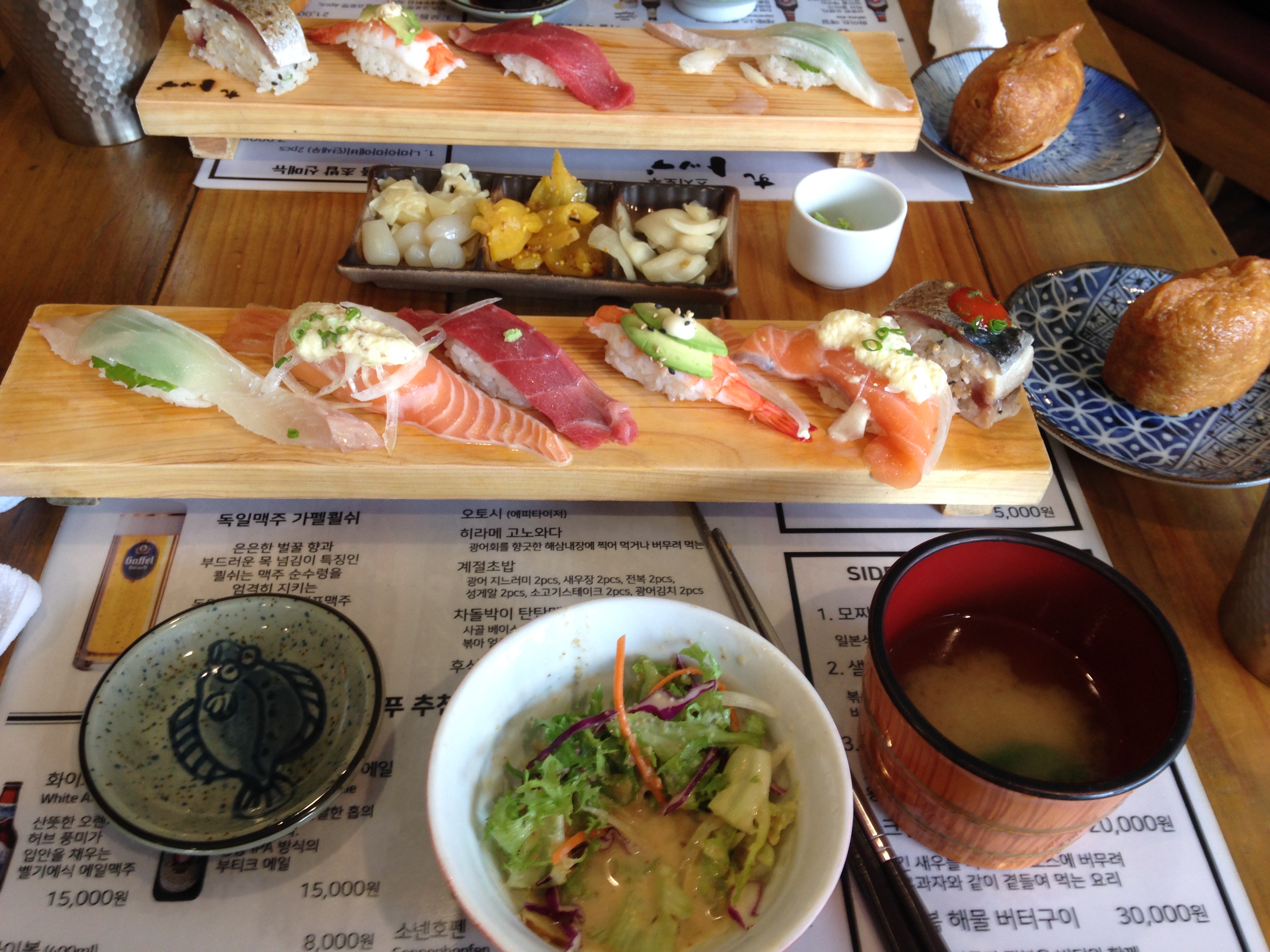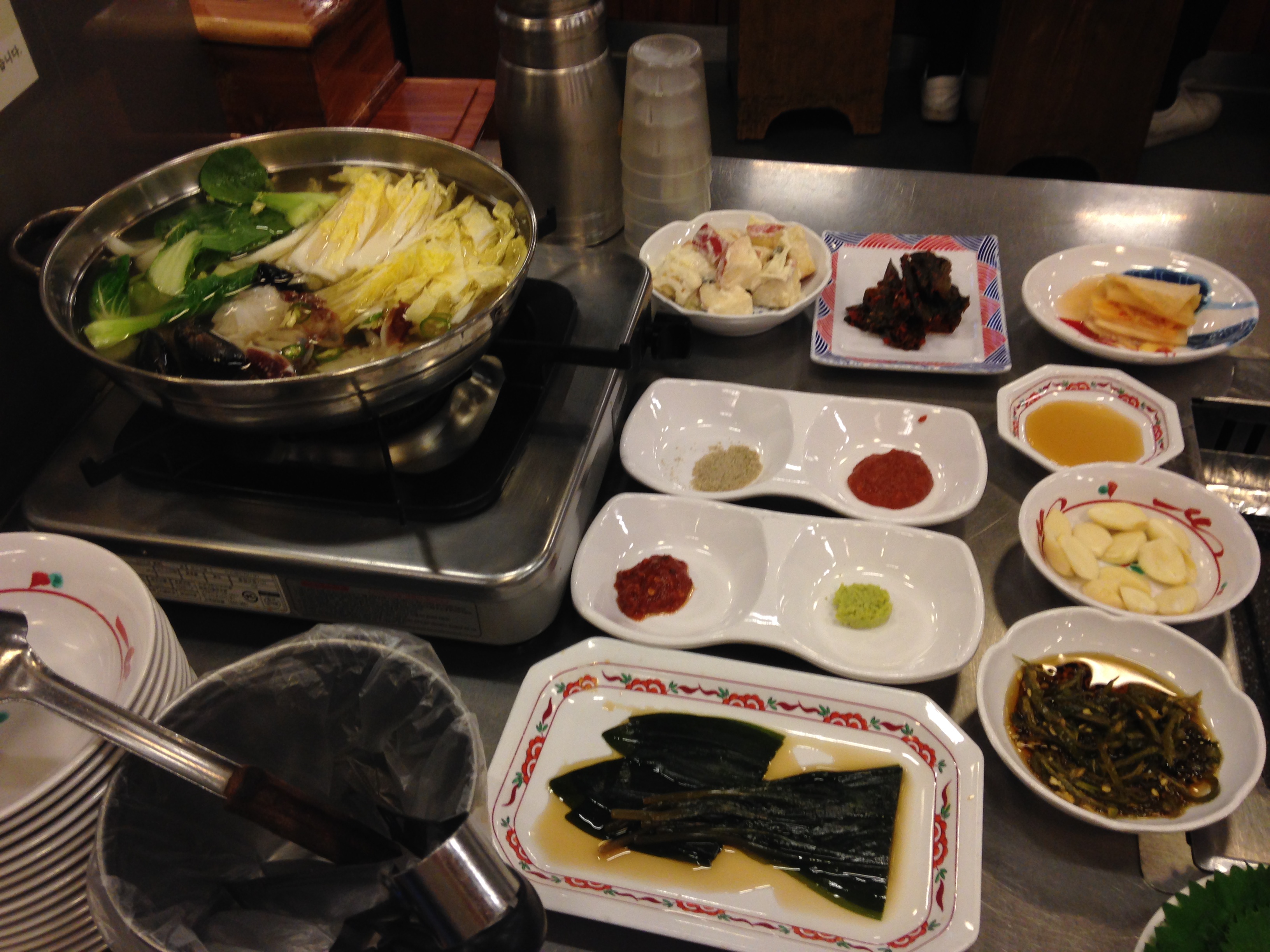 너무너무너무 반찬이 잘 나옵니다. 파절임도 맛있고, 갓김치랑, 명이나물이랑, 고추장아찌랑, 사과사라다(샐러드 아님 사라다!) 음식이 다 너무너무 깔끔하게 잘 나옵니다. 그리고 돼지고기 집인데 기본으로 해물 육수 베이스의 샤브샤브탕을 줍니다..으으으.. 주력메뉴 (꽃삼겹, 통삼겹, 통목살)1인분이 14000원으로 가격이 있지만… 그래도 정말 맛있게 잘 먹었습니다!
